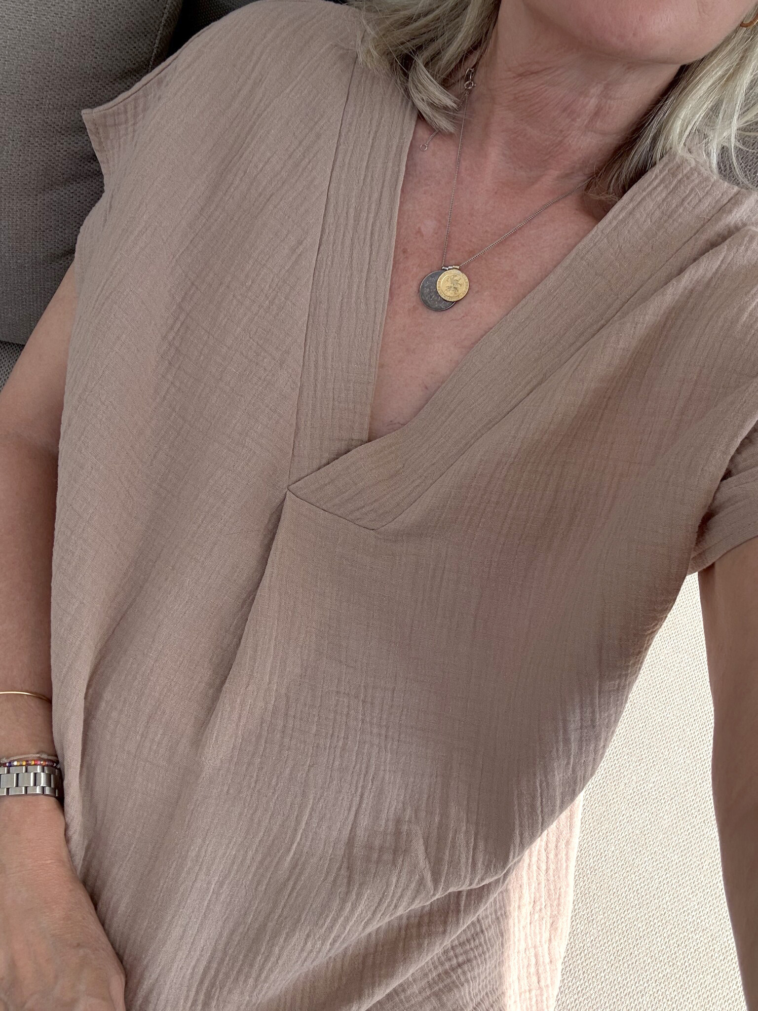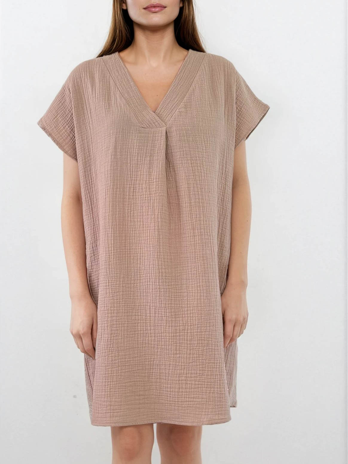 Cosy Tunic Dress Taupe. A lovely basic mini dress in tunic style! The fabric is 100% cotton in fine muslin that is oh-so-lovely to wear in sweltering weather.